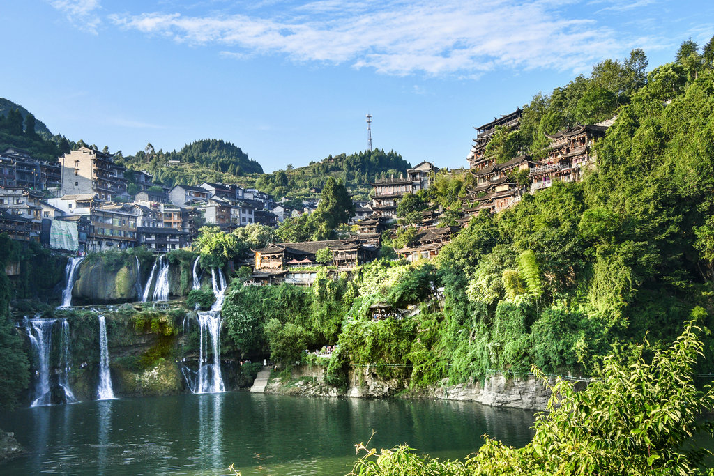 芙蓉鎮,原名王村,是湘西一座擁有兩千多年歷史的古鎮,因瀑布穿鎮而過,得名「掛在瀑布上的千年古鎮」。這裡保留了完整的五里青石板長街和土家吊腳樓羣,土家風情濃郁。