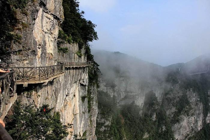 玻璃棧道懸於天門山山頂西線,長60米,最高處海拔1430米,是天門山景區繼懸於峭壁之上的鬼谷棧道、憑空伸出的玻璃眺望臺、橫跨峽谷的木質吊橋後打造的又一試膽新景點。這條看著就讓人腿軟的玻璃棧道給人帶來的刺激震撼感可與美國大峽谷玻璃走廊“天空之路”媲美。晴天時,藍天和白雲的倒影鋪滿了整條棧道,讓人在對脚下的透明戰戰兢兢之餘,更樂享於踏雲而行的快感; 雲霧天氣,玻璃棧道則在霧中若隱若現,天上人間的美景更是讓人驚歎不已。