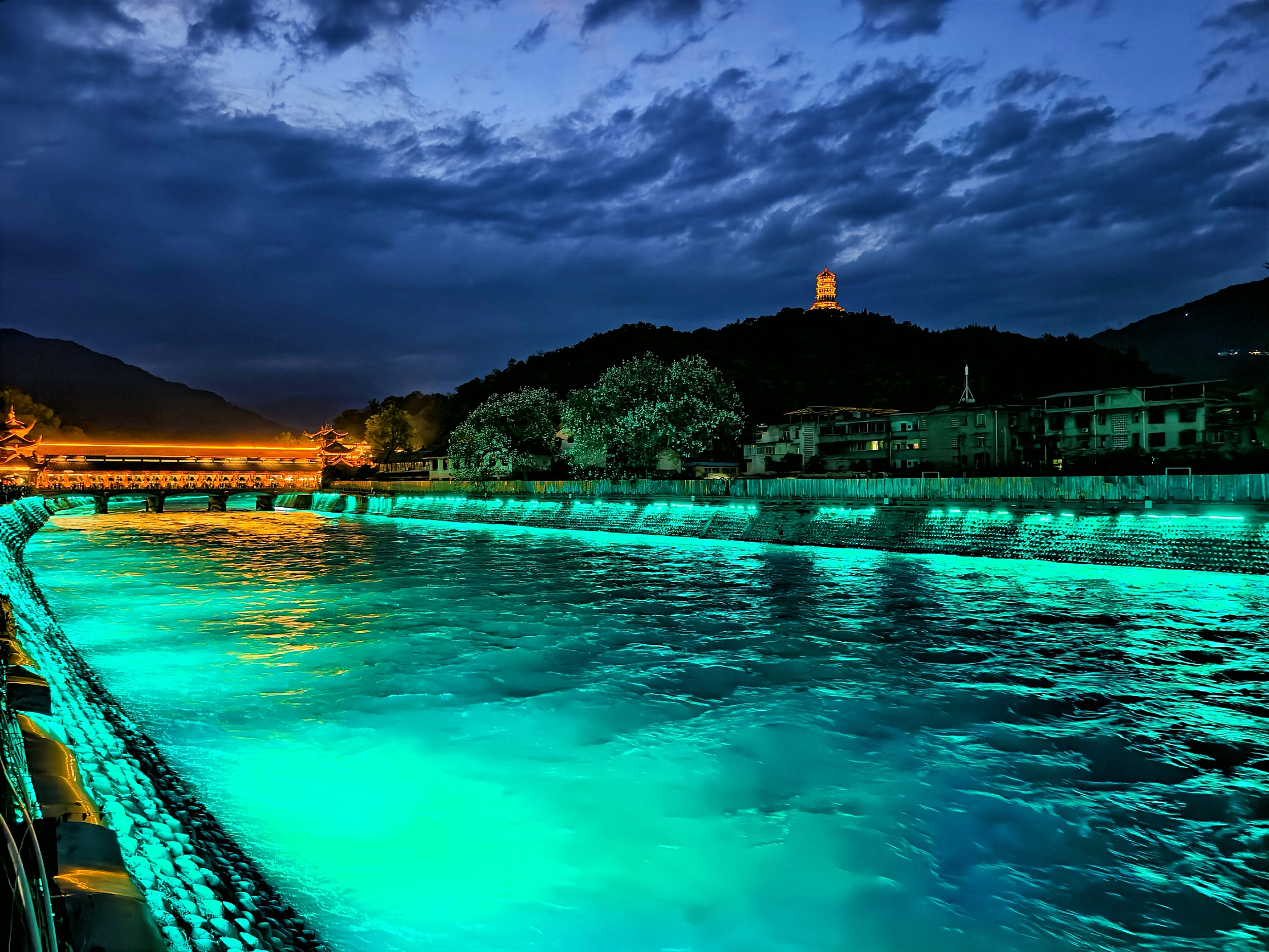 指都江堰夜間的燈光秀景觀,尤其在水利工程周邊,藍色燈光映照水面,形成如夢似幻的「藍眼淚」效果。結合古堰夜景,營造出寧靜而浪漫的氛圍,是攝影與夜遊的亮點。