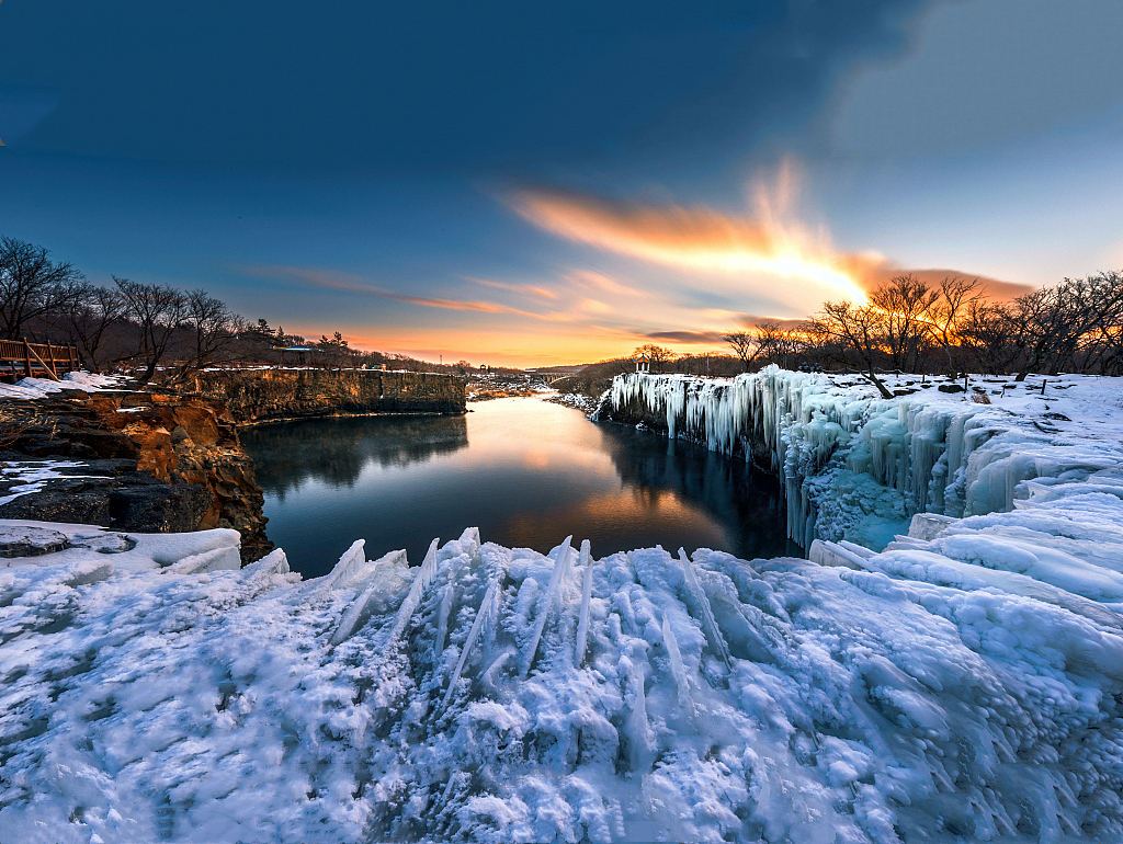 冬季的鏡泊湖吊水樓瀑布凝結成巨大的冰瀑,晶瑩剔透,落差20余米,氣勢磅礴,這樣的雪國風光、冰瀑奇觀,即使在東北也是頗為罕見。