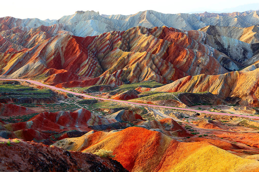 張掖七彩丹霞是中國色彩最斑斕的丹霞地貌,紅、黃、橙、綠、白、灰等色帶交織,猶如大地調色盤。其窗櫺狀、宮殿式的地質形態,被專家譽為「丹霞地貌精品中的精品」。