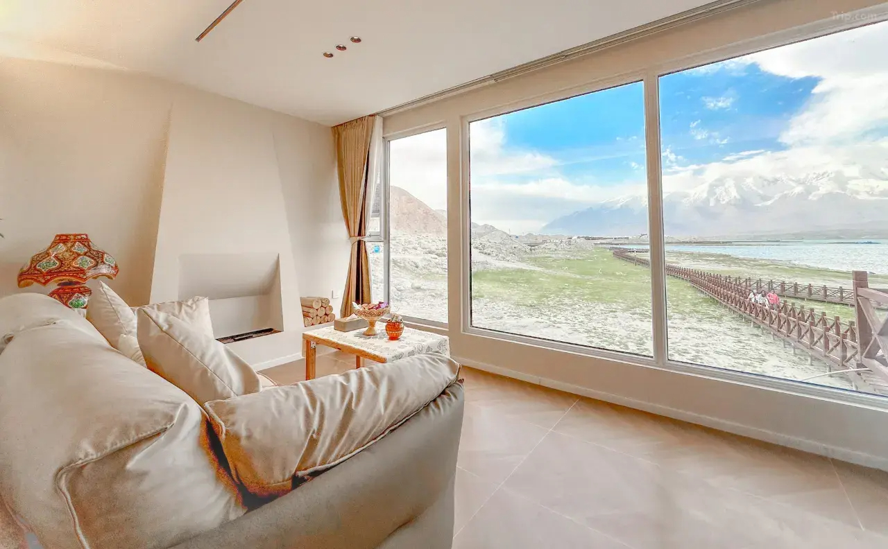 不周山營地公園位於帕米爾高原核心區域的喀拉庫勒景區內,飯店臨湖而建,所有客房均直面喀拉庫勒湖,在房間內即可看到帕米爾高原昆崙山脈的第1、第2、第3高峰。天氣狀況好的情況下,早晚都可以看到日照金山奇景,晚上可以看到浩瀚的銀河星穹,客房內有地暖、空調、落地觀景窗、露台,營地配套一個咖啡吧和餐廳,能為遊客提供舒適的住宿和觀景環境。