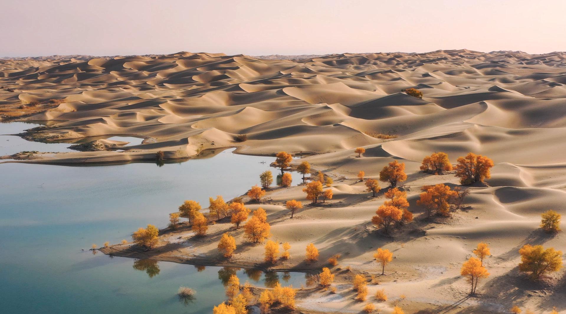 白沙湖位於新疆阿勒泰地區,它的獨特之處在於,一池碧綠的湖水被潔白的沙山環繞,形成「塞北小江南」般的奇特景致。湖中生長著茂密的蘆葦、菖蒲,甚至還有野荷花,湖周則環繞著楊樹、白樺混生的林帶,景觀層次非常豐富。無論季節如何變換,湖水始終不增不減,不凝不濁,其成因也十分神秘。