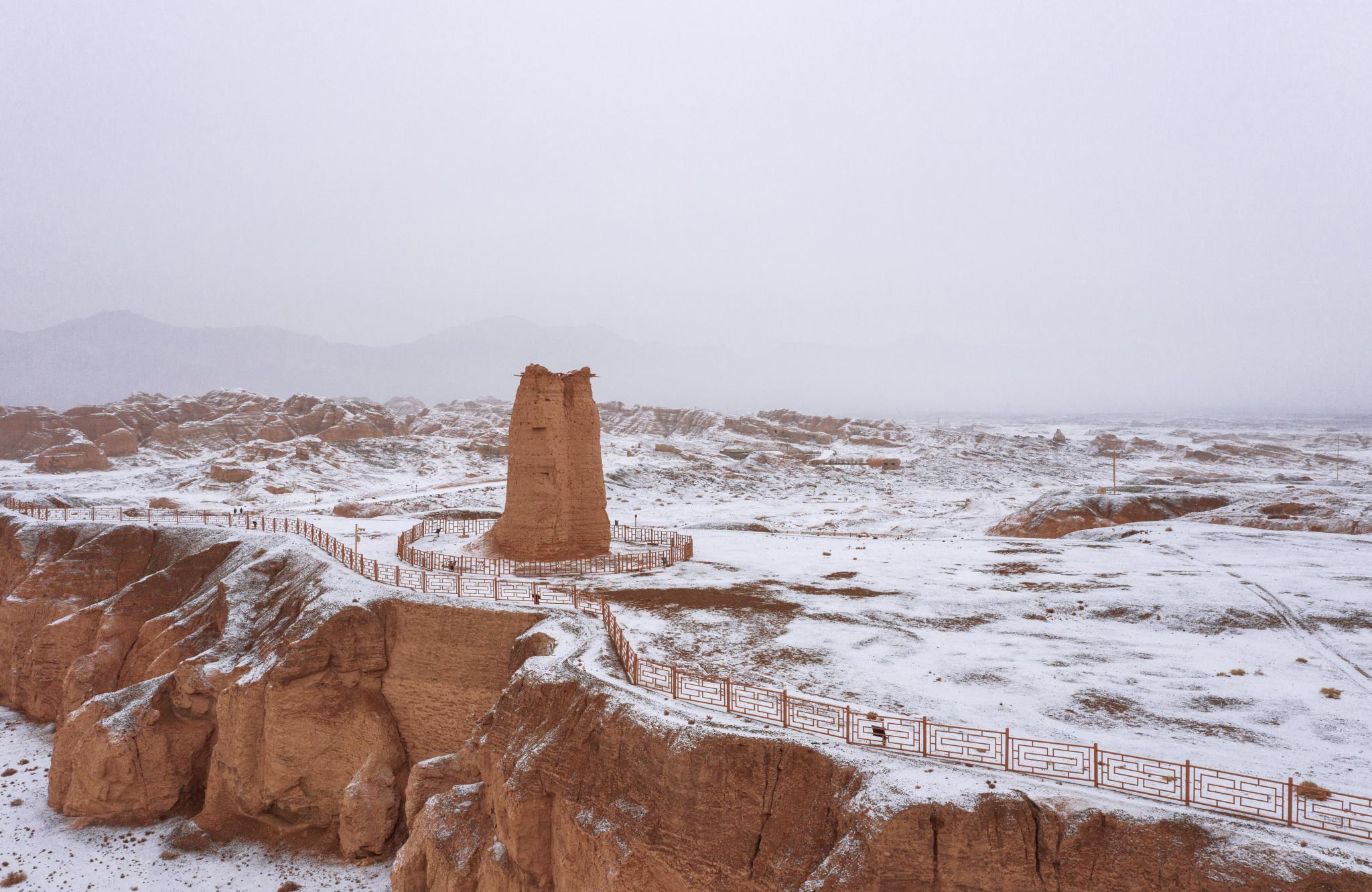 克孜爾尕哈烽燧位於庫車市西北約10公里處,是漢代建於西域都護府時期的重要軍事預警設施。在維吾爾語中意為「紅嘴老鴰」或「紅色哨卡」,這座烽燧基底呈長方形,現存殘高約16米,是目前古絲綢之路北道上時代最早、保存最完好的烽燧遺址。烽燧主體為夯土構築,上部以木柱為骨架,頂部曾建有望樓。古人通過「晝舉燧,夜舉烽」的方式傳遞軍情,信息一日可達數千里。屹立荒野兩千多年,它不僅是古代軍事智慧的實物載體,也是絲綢之路上滄桑變遷的沉默見證者。