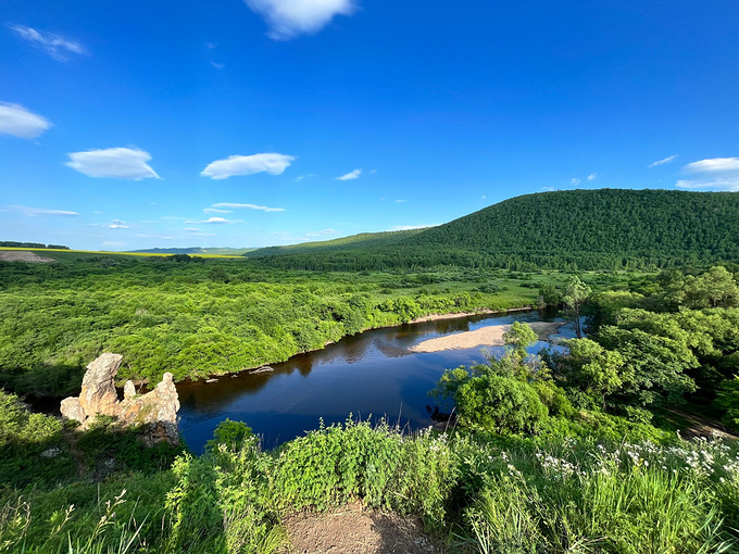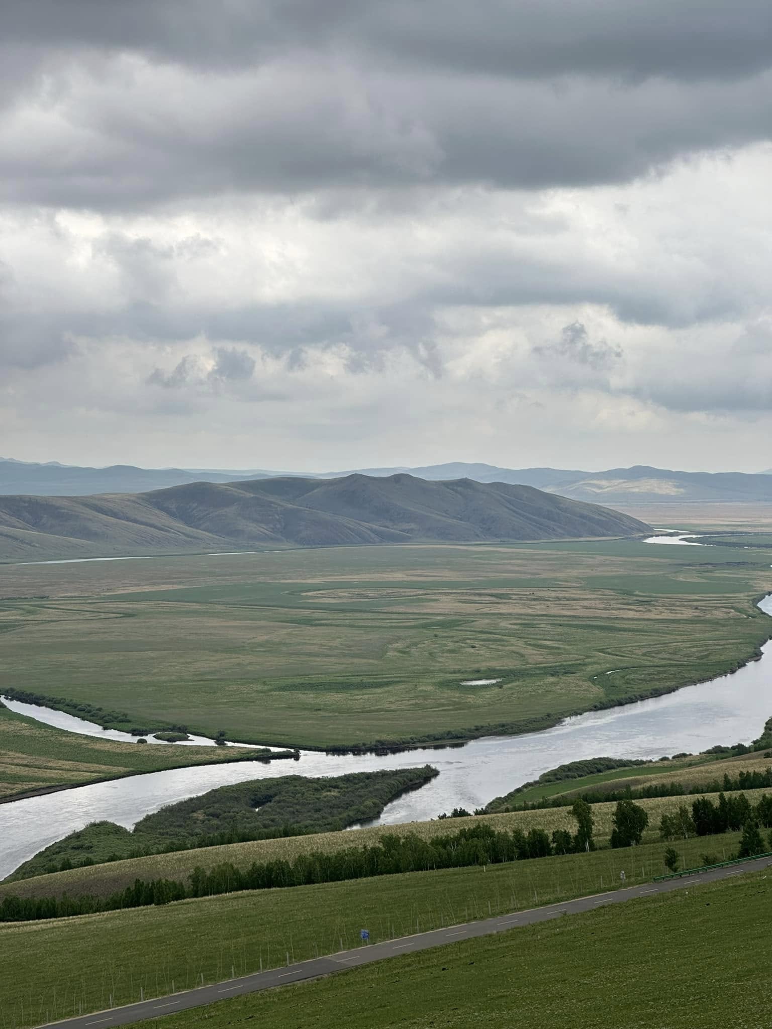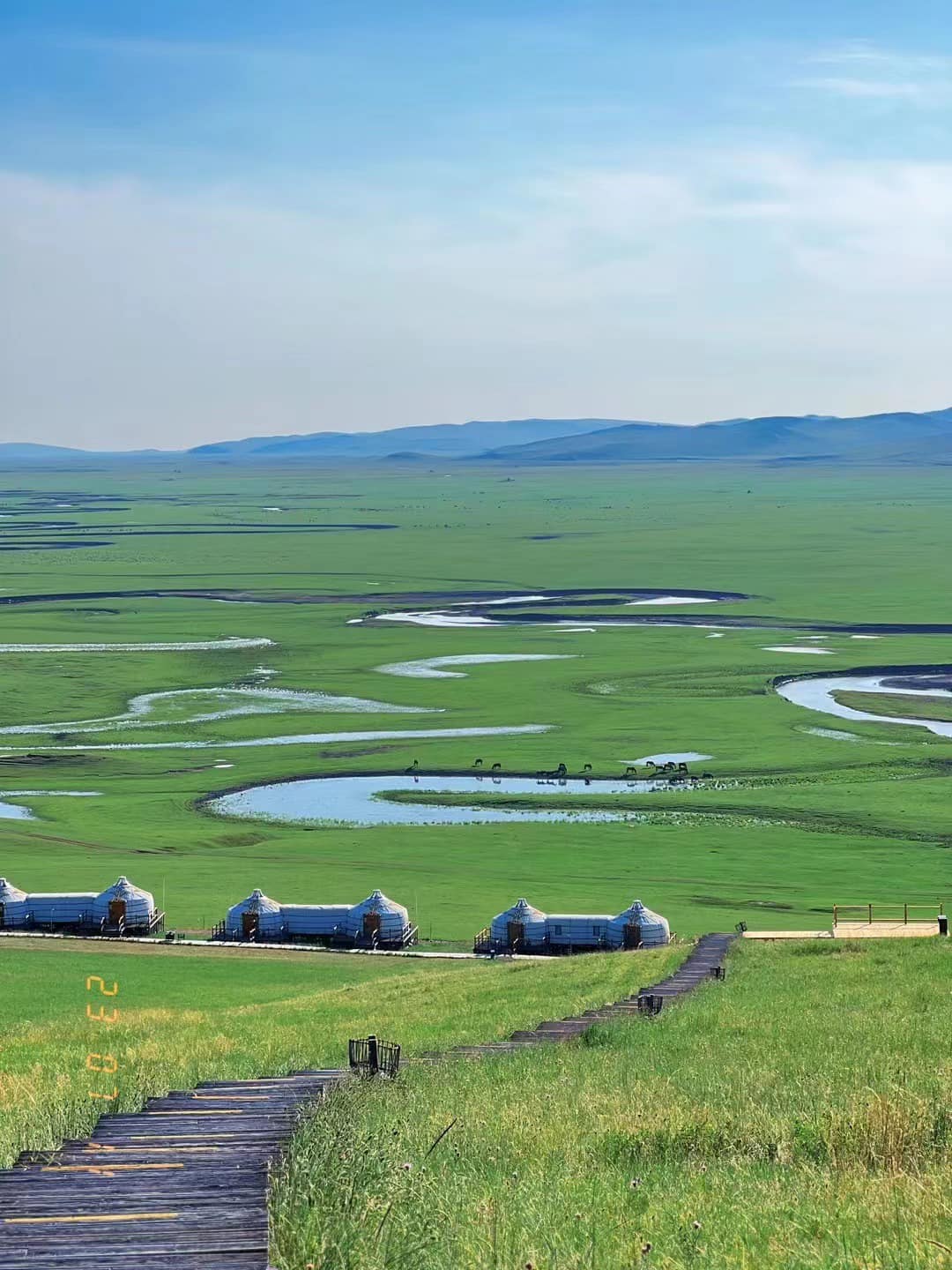 被老舍先生譽為「天下第一曲水」的莫爾格勒河,河水蜿蜒流淌,隨處可見蒙古包,牛羊成群在河邊飲水。