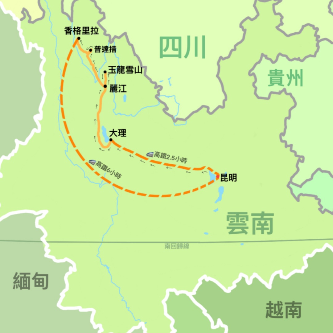 2. 高鐵:昆明-大理、香格里拉-昆明動車二等座;