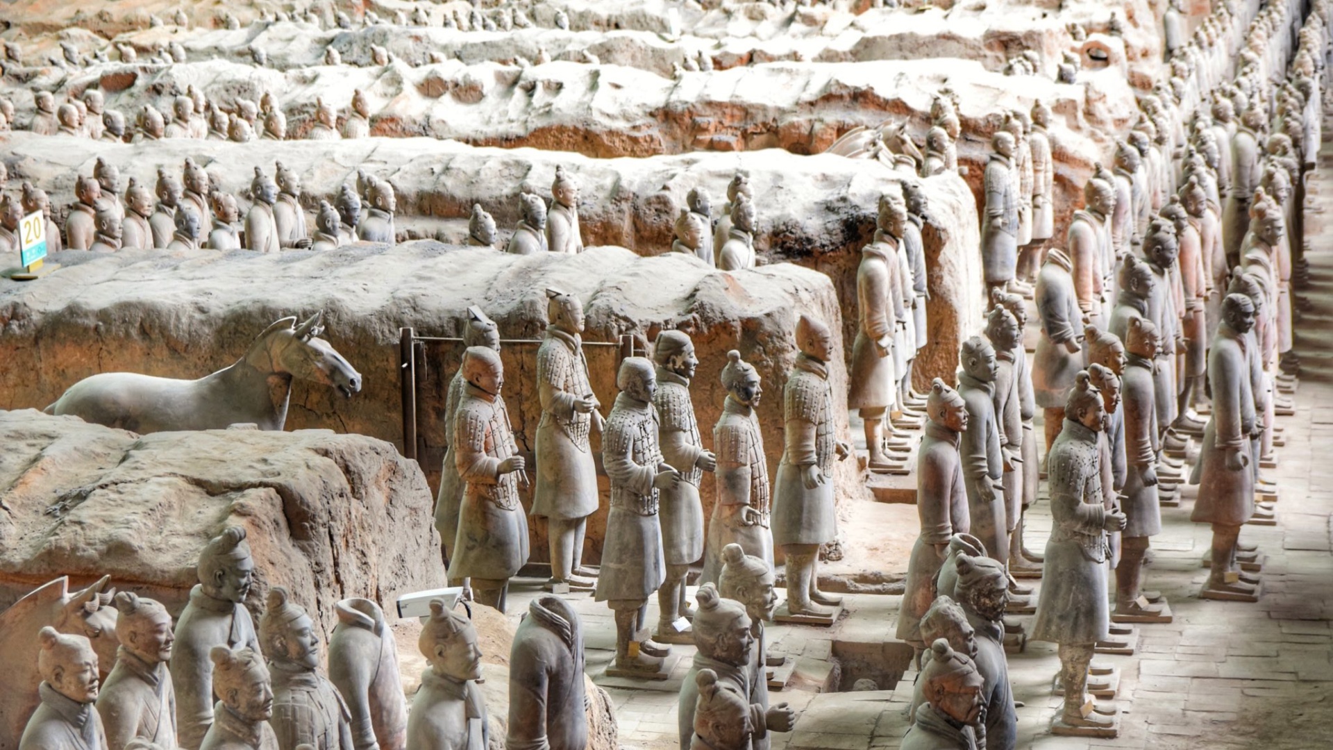 兵馬俑是秦始皇陵的陪葬坑,被譽為「世界第八大奇蹟」。這些陶製軍陣規模宏大,已發掘的三個坑內共有兵俑、馬俑近8000件,包括將軍、步兵、騎兵等不同兵種,形態各異、栩栩如生。俑坑採用「模塑結合」手法製作,並原為彩繪,展現了秦代高超的雕塑與軍事組織水平。其中一號坑的規模最大、兵馬俑數量最多,可清晰感受秦軍陣列的磅礴氣勢。